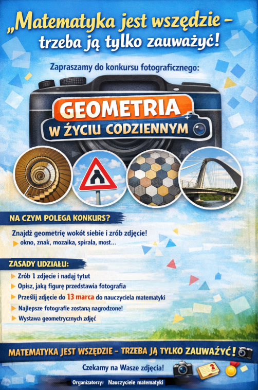 Matematyka jest wszędzie – trzeba ją tylko zauważyć! Zapraszamy wszystkich uczniów do konkursu fotograficznego „Geometria w życiu codziennym”. Szczegóły na plakacie.