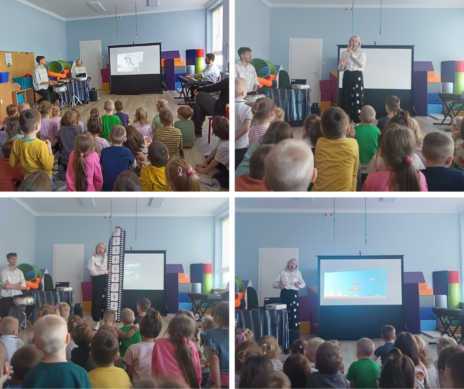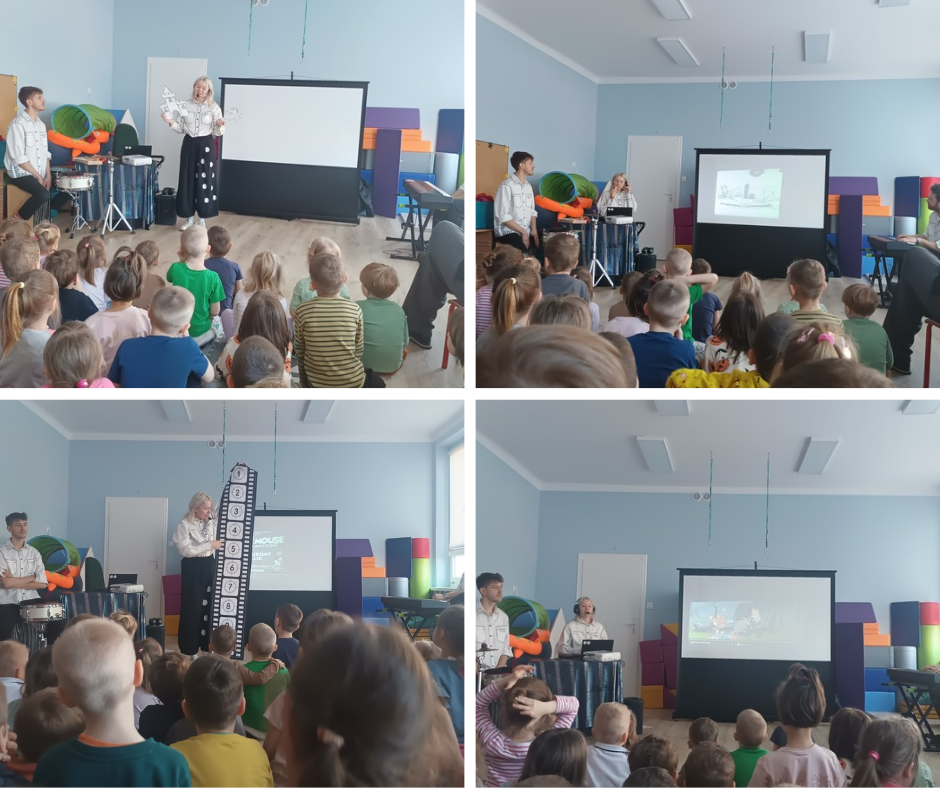Podczas projekcji dawnej bajki o Myszce Miki artyści sami tworzyli dźwięki do filmu, wykorzystując różne instrumenty, m.in. flet, cymbałki, bębenek oraz kahon. Przedszkolaki dowiedziały się także, na czym polega dubbing – czyli podkładanie głosu postaciom w bajkach. Pani, która występowała zaprezentowała to w praktyce, podkładając głos do bohaterów wyświetlanej animacji.
