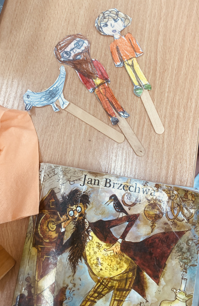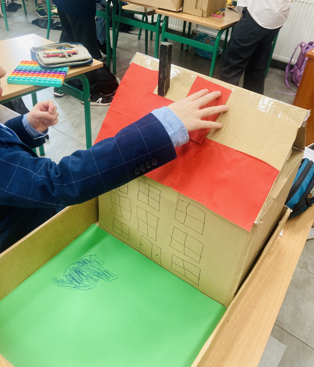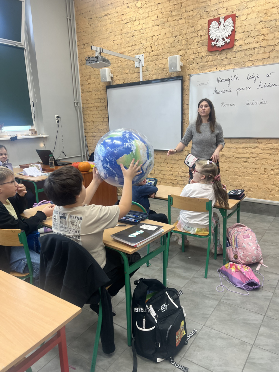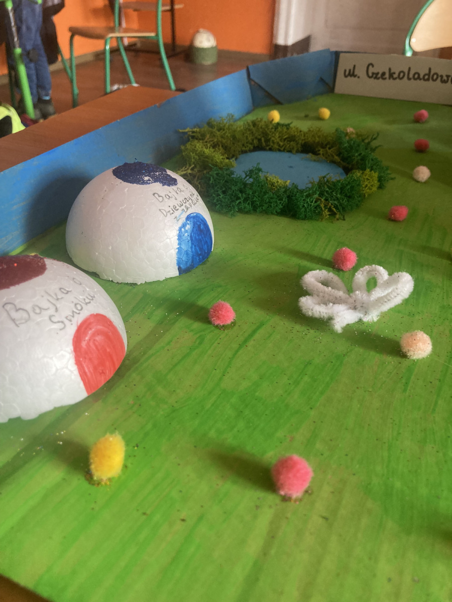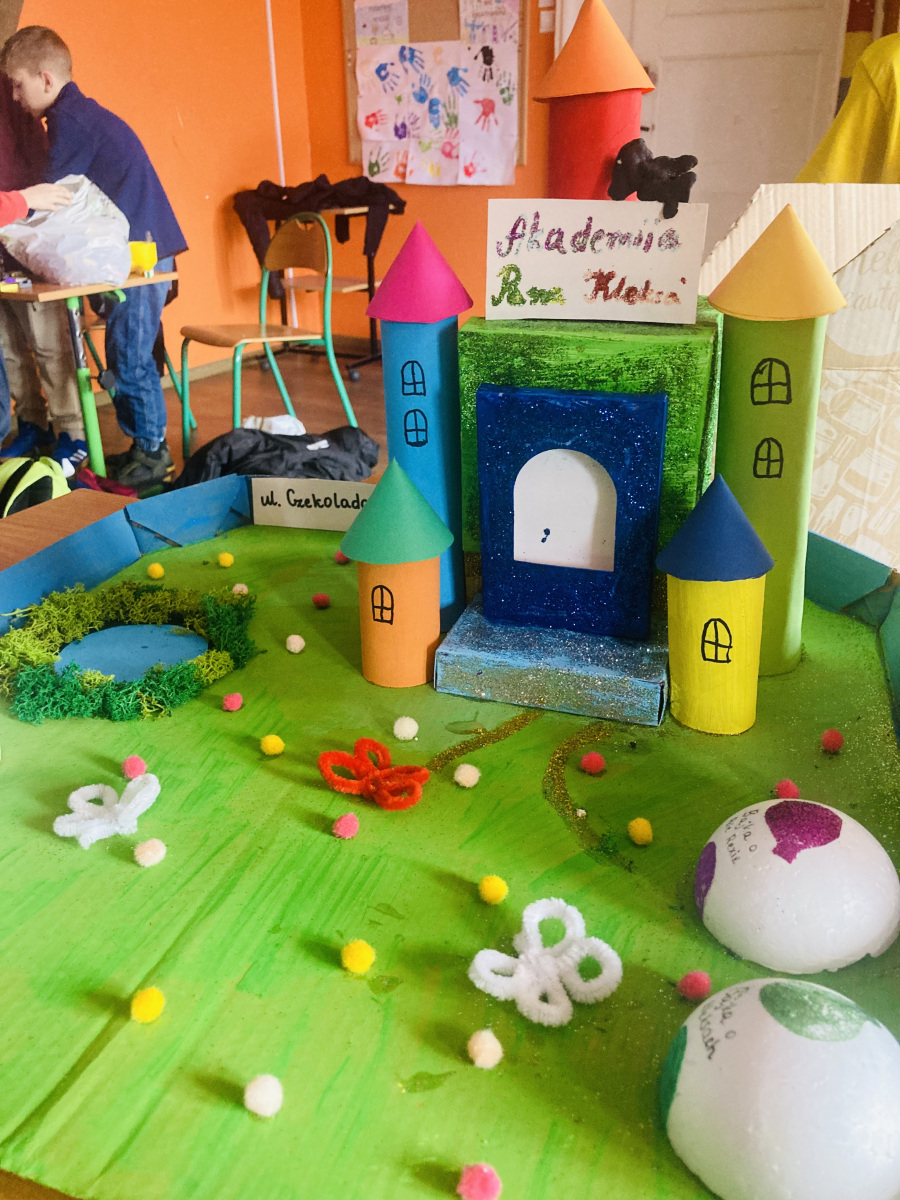 Klasy 4a i 4c na chwilę przeniosły się do świata lektury Akademia pana Kleksa i uczestniczyły w niezwykłych lekcjach z książki. Nasi uczniowie brali udział w lekcjach kleksografii, przędzenia liter, geografii czy potretologii. W trakcie zajęć losowali kolorowe szkiełka, rozwiązywali test wiedzy z balonami, rozplątywali nici, pisali kartki pocztowe do pana Kleksa, rysowali portrety zgodnie z opisem postaci, a na koniec budowali makiety akademii. Budowle były nie tylko sprawdzeniem czytania ze zrozumieniem, ale przede wszystkim twórczą zabawą z tekstem literackim. Powstały wspaniałe projekty m.in. z lego, pudełek, kartonów, a nawet zbudowane w Minecrafcie i Robloxie. Na każdej lekcji rozdawane były błyszczące piegi, na które uczniowie cieszyli się bardziej, niż na zwykłe oceny z zadania.