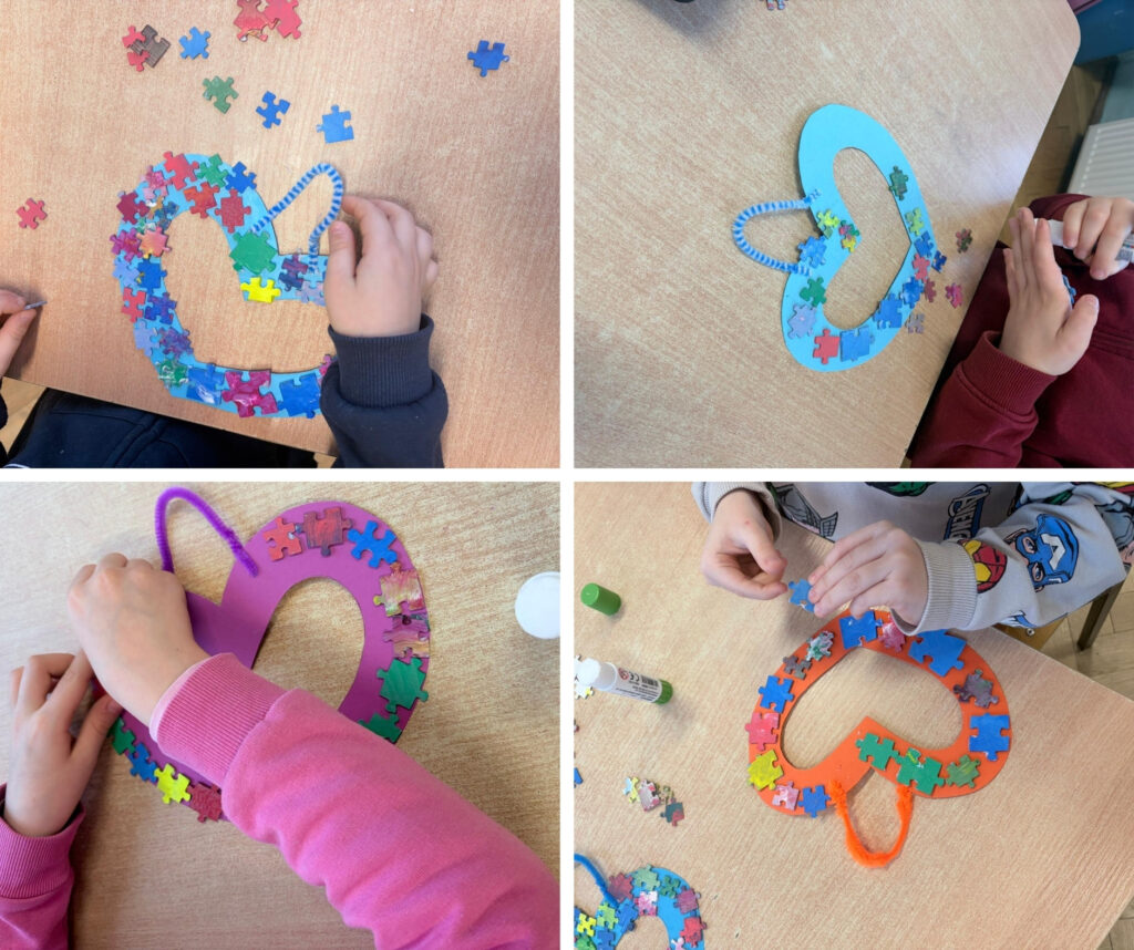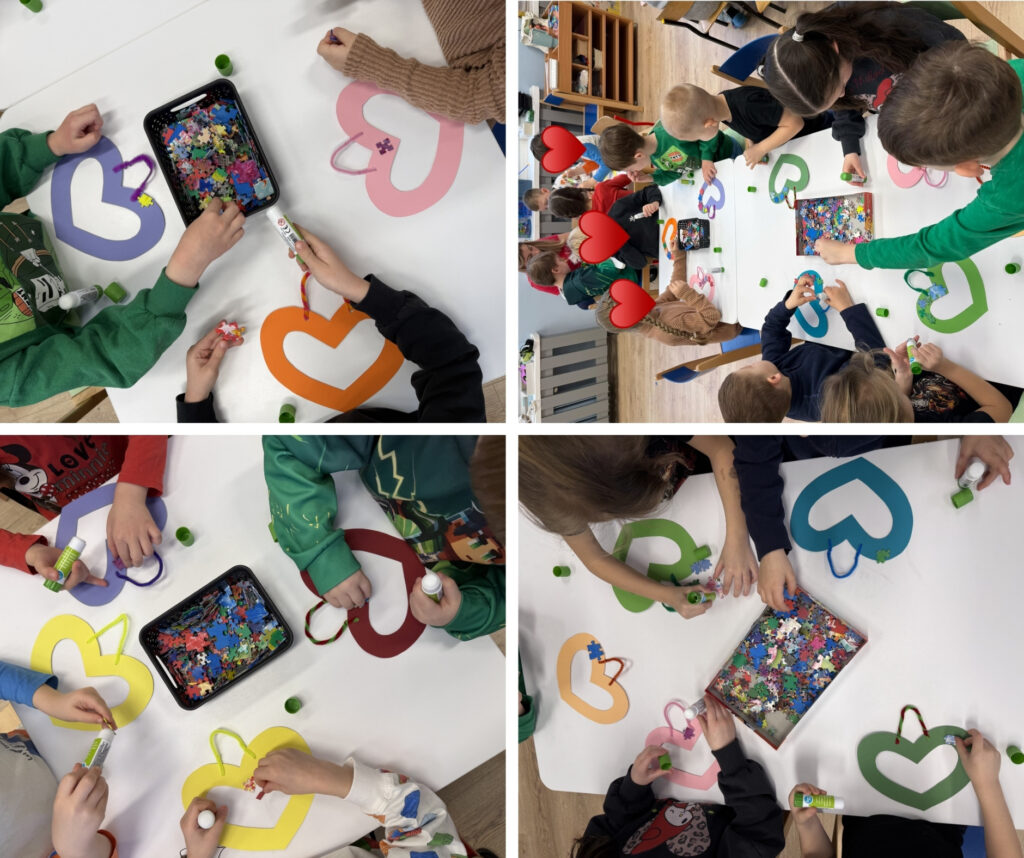 Walentynkowe szaleństwo w naszym przedszkolu! ❤️ Muzyczna zabawa, rozmowy o święcie zakochanych, a na zakończenie wyjątkowe serduszka z puzzli pięknie pomalowanych przez naszych starszych kolegów ze szkoły – świetliczaków !