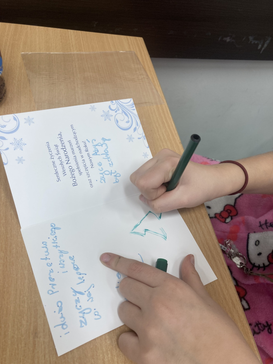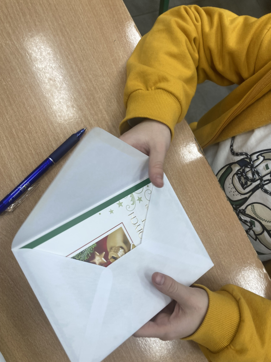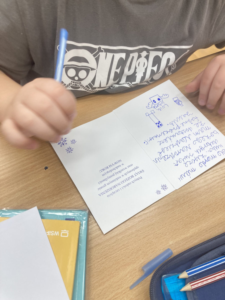 Dziś klasa 4 wziełą udział w akcji „Idą święta, nie o SMS-esie, lecz o kartce pamiętaj” Na lekcji języka polskiego wróciliśmy do tradycji pisania i wysyłania kartek pocztowych z życzeniami. Wszytsko odbyło sie z odrobiną tajemnicy, bo każdy losował osobę i nie zdradzając do kogo pisze, tworzył życzenia, rysował obrazki i adresował kopertę. Teraz pozostaje nam czekać na listonosza i odebrać swój pierwszy list i życzenia na Święta Bożego Narodzenia.