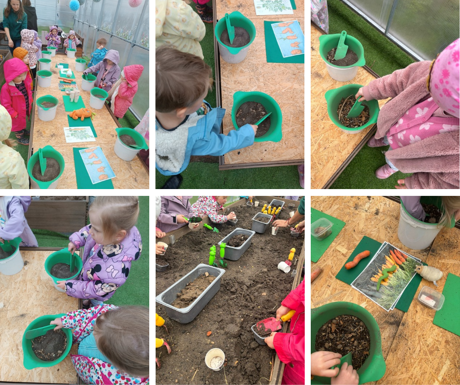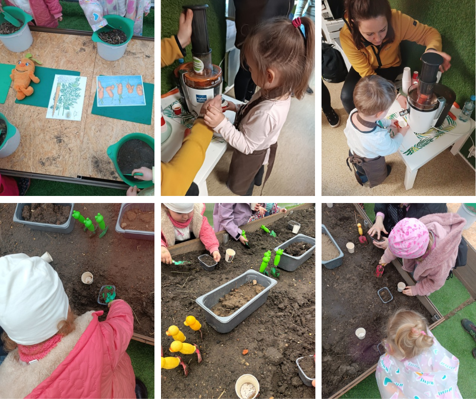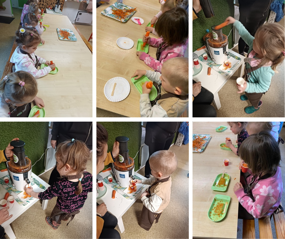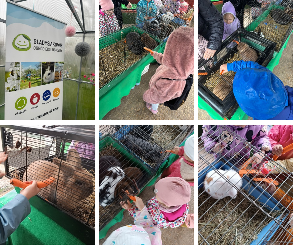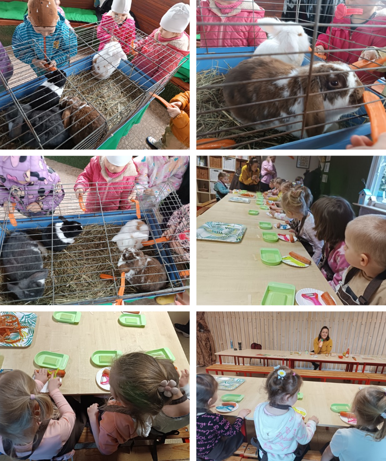 Na miejscu dzieci karmiły króliczki, brały udział w warsztatach o marchewce – obierały ją, tarły i robiły sok, a na koniec w szklarni samodzielnie siały nasiona marchewki.